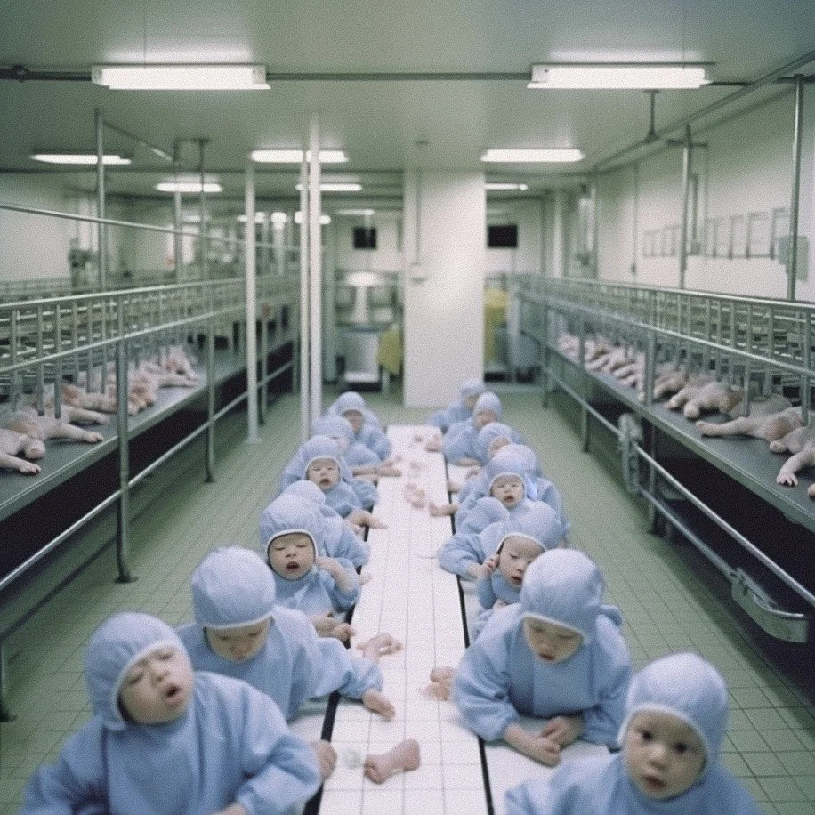 Little boys are depicted in a factory farm; some body parts are seen on agricultural conveyor belts, ready to be packaged and shipped to supermarkets nationwide. Dozens of male toddlers sit terrified, awaiting a similar fate, whilst they long for their enslaved mothers.